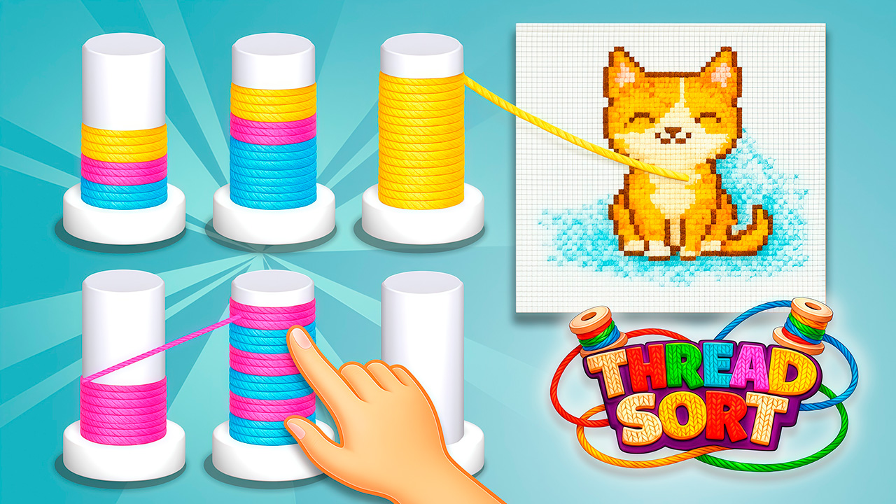 Tap a spool to pull the top thread and move it onto another spool with the same color or onto an empty peg. Arrange all threads so that each spool contains only one color. When a spool is filled with a single color, its thread connects to the canvas and begins stitching the picture automatically. Plan your moves carefully to avoid running out of space and complete the artwork.