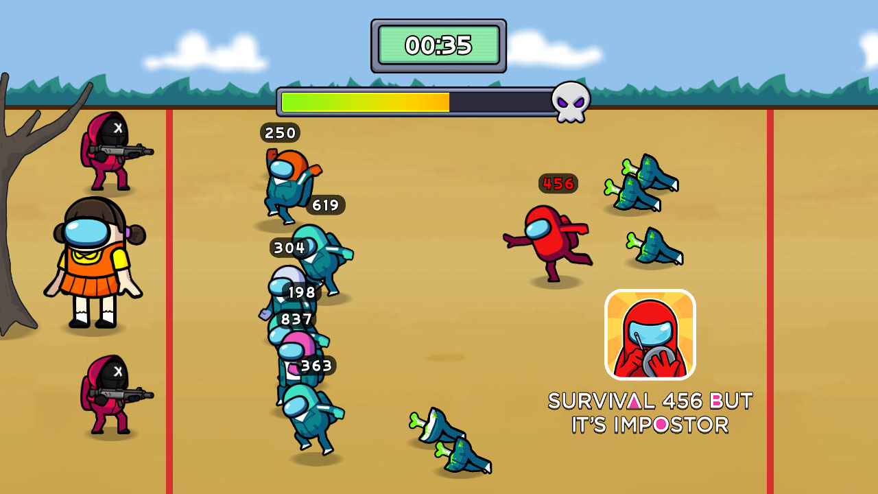 How to play Survival 456 But It's Impostor game:ÏŸ Touch the player to moveÏŸ Run fast while the doll is countingÏŸ Stand still when the doll turns its headÏŸ Be one of the 5 people to finish firstÏŸ The game will end if you reach the finish line late and let the red light see you move